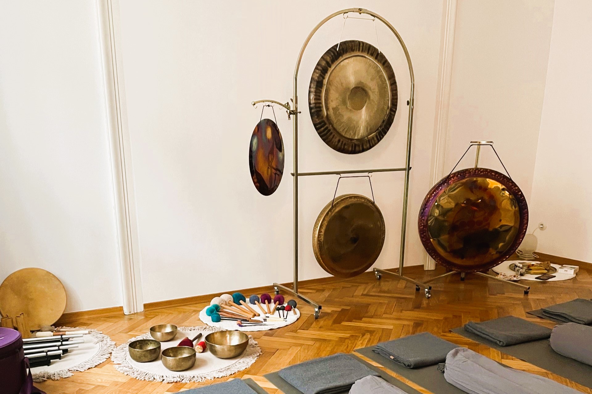 Gongová lázeň se uskutečnila v prostorách půvabného studia Milada na Praze 7. Komorní prostředí, parketová podlaha a plné vybavení jógového studia vyhověly požadavkům na uspořádání gongové lázně v plném rozsahu.